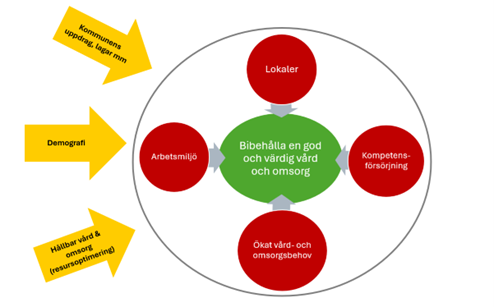 Kompetensförsörjningen inom vård och omsorg är en stor utmaning. Inom både regionen och kommunerna kommer det att inom dessa yrkesgrupper vara stora pensionsavgångar de närmaste tio åren. Samtidigt ökar antalet personer i arbetsför ålder inte alls i samma utsträckning vilket innebär färre människor i arbetsför ålder samt att konkurrensen om arbetskraft mellan och inom branscher kommer att öka.